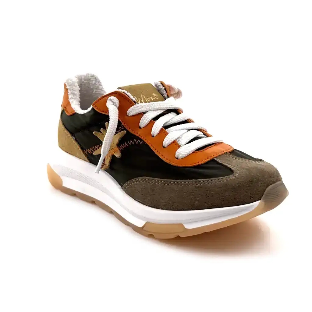 Designed by Moni , the Runny 101 embodies the spirit of urban nature chic with an originality and a generous use of materials rarely seen in women's sneakers. The velvety brown suede toe provides warmth, a natural texture, and the characteristic softness of quality suede, while the lightweight and breathable khaki canvas ensures lightness and comfort for active days. The orange panels are the detail that transforms this model: vibrant and dynamic, they provide a bold color signature that gives the sneaker its true character and instantly sets it apart in any wardrobe. The 2.5 cm platform sole reduces the effective arch to just 1.5 cm , offering a comfortable and natural fit all day long. These sneakers pair equally well with slim jeans and a khaki or orange t-shirt for a coordinated nature-inspired look, with cargo pants and a white top for a confidently chic outdoor style, or even with a midi skirt and a brown sweater for an unexpected and feminine contrast.