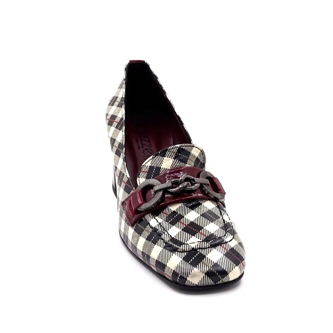 Mocassins à Talon Ivoire E612 Cuir Vernis Tartan Noir Beige et Bordeaux
