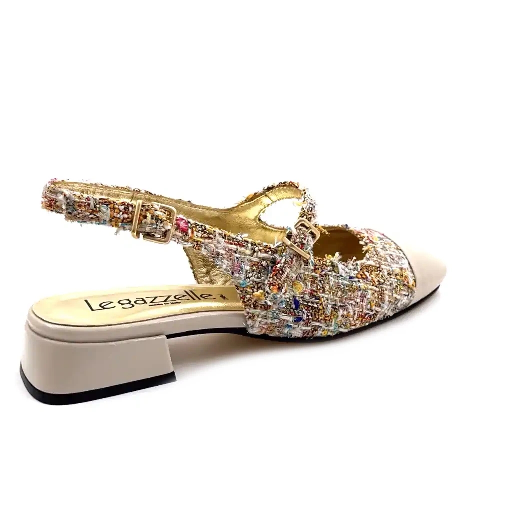 Marque : Ivoire — Type : Babies — Matière : Cuir verni & Tweed — Couleur : Beige & Multicolore — Détail : Lanière ajustable — Genre : Femme — Style : Rétro chic contemporain