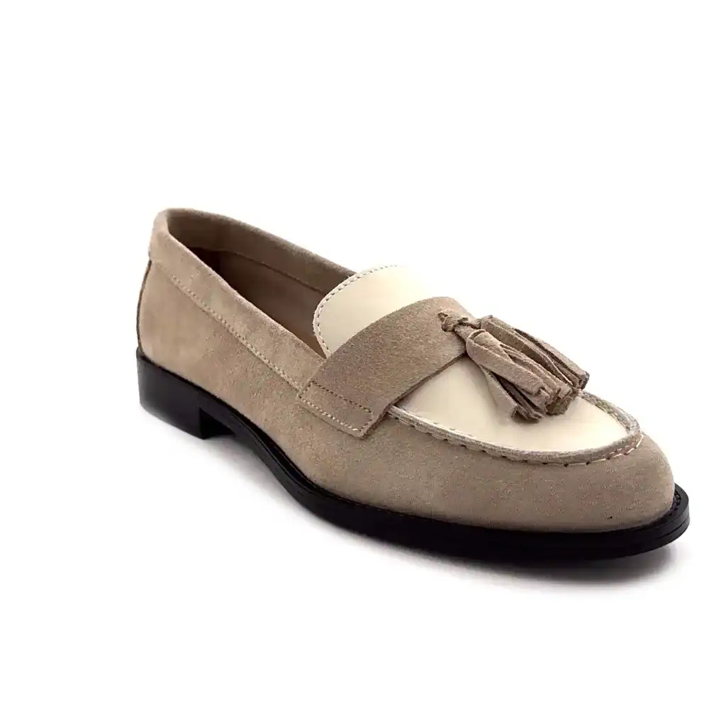 Beige Suede & Cream Leather Loafers — Ivoire 26390 — Tassels — Women's